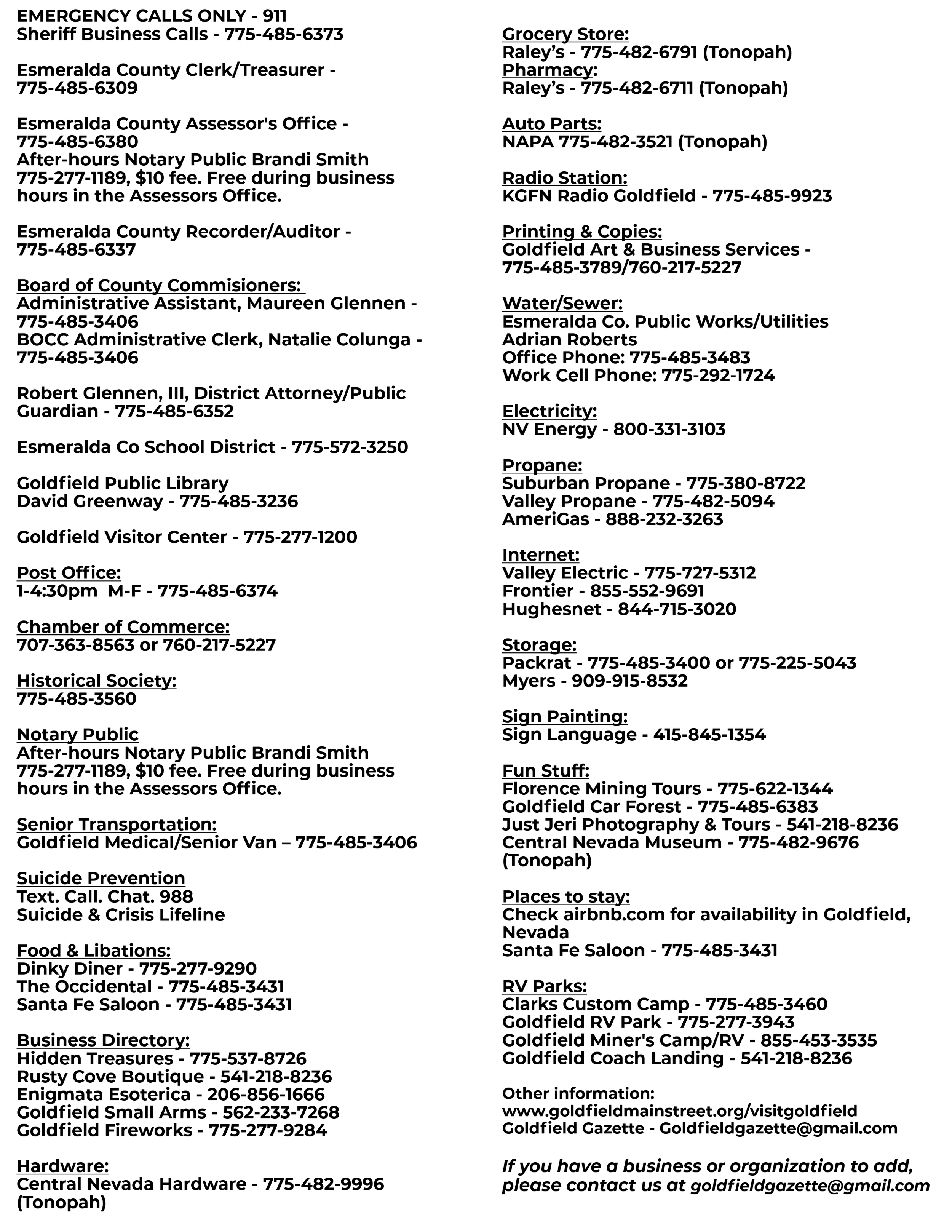 Goldfield Art & Business Services 775-485-3789 at 306 E. Crook Ave. (Highway 95)